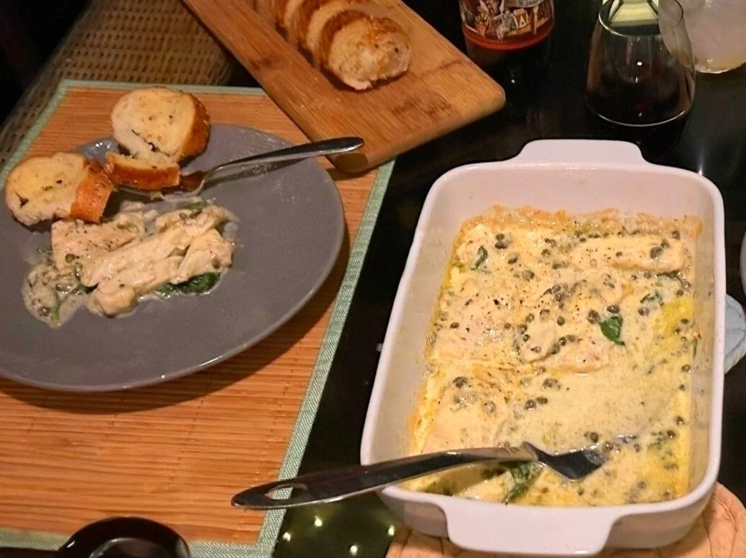 This recipe is a Rogers' family favorite.  Made by Sally Rogers, Captain Peter's mom, when Bob Rogers, Peter's dad, would come in with his catch off the Gulf.  Made with any firm fleshed white fish, it is a meal in a dish.  Just be careful on spinach quantities - too little and it wilts to nothing, too much and the sauce will be soupy.  Half a large bag is probably a good starting point.